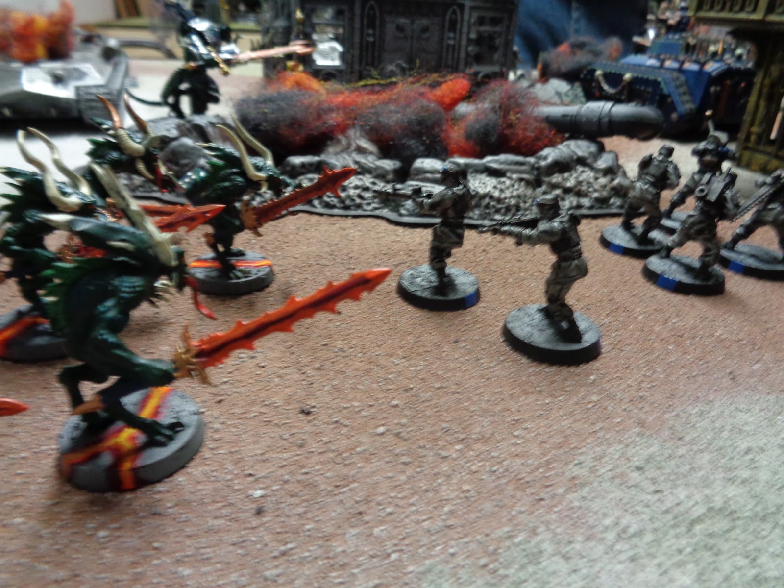 Stygian infantry set up a crossfire for the squad that had blown up the manticore. under a hail of fire seven of the guardsmen were viciously cut down with the three dazed survivors fleeing in panic.