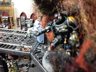Remus watched the death guard advancing through the ruins. He clicked a soft vox signal to Tiberian. "Contact, death guard infantry advancing in our direction. Engaging." A shot sounded out and a lone plague marine fell forward without a head. Brother Vincinian in the gantry threw a smoke grenade to obscure the vanguard positions.